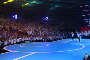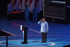 Paslon nomor urut 2, Prabowo Subianto dan Gibran Rakabuming Raka, menghadiri konsolidasi pendukung di Sentul International Convention Center (SICC), Sentul, Kabupaten Bogor, Jawa Barat. Keduanya kompak mengenakan kemeja biru muda.