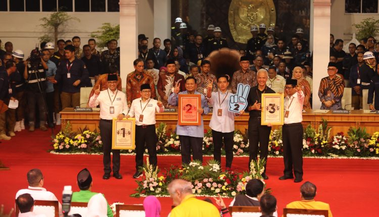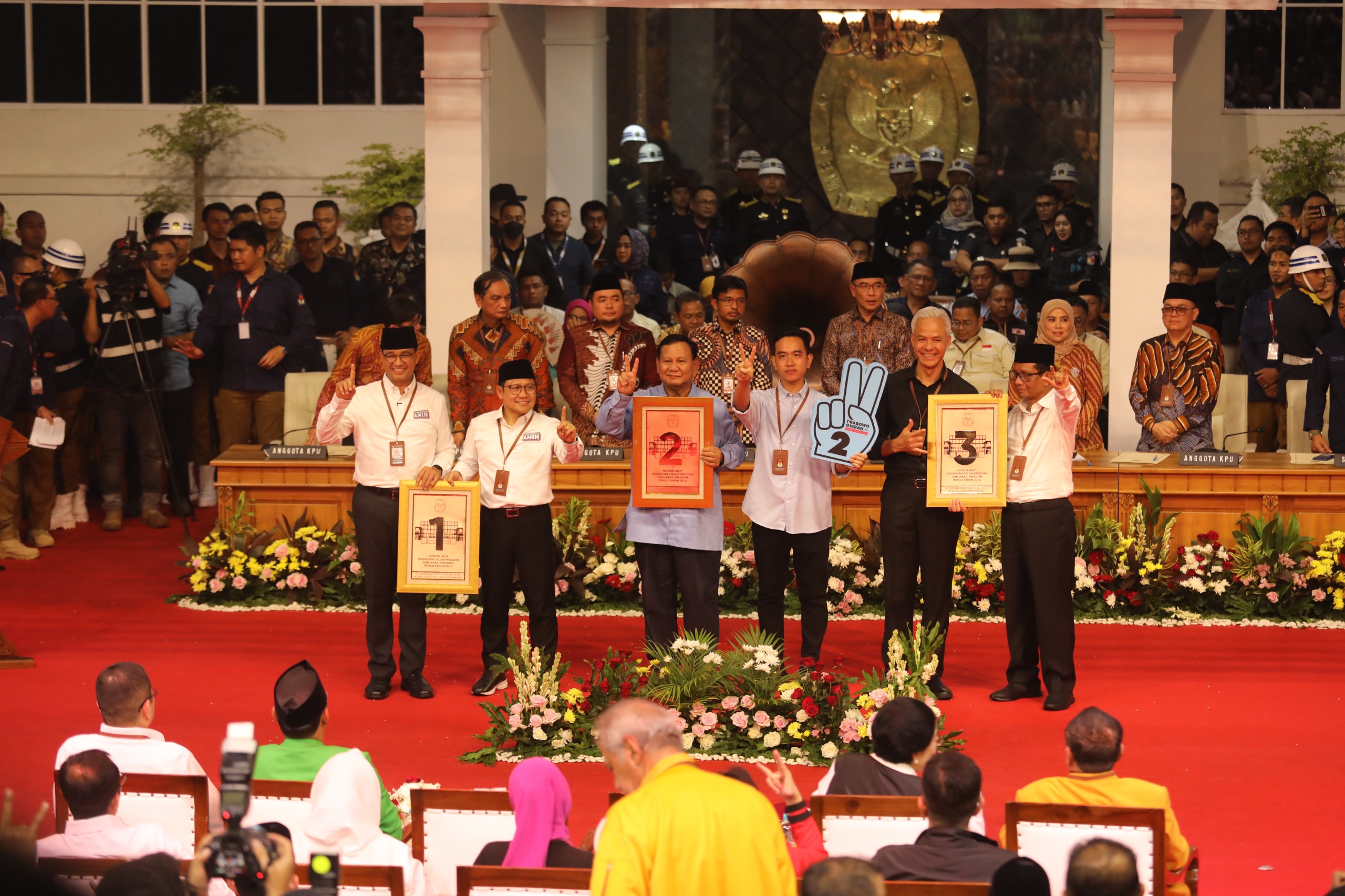 Masing-masing pasangan Calon Presiden dan Wakil Presiden peserta Pemilu 2024 dipanggil oleh Ketua KPU Hasyim Asy’ari untuk mengambil undian penetapan nomor urut.