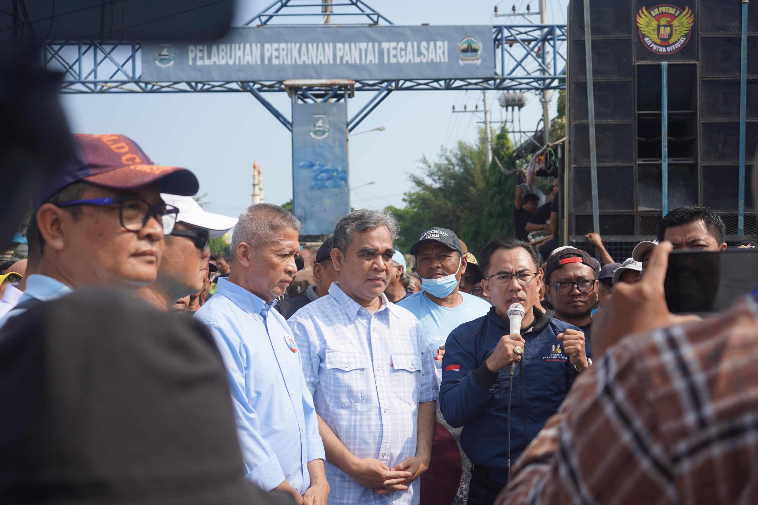 Swarapita.com, Tegal – Sekjen Partai Gerindra sekaligus Wakil Ketua Tim Kampanye Nasional, Ahmad Muzani, menghadiri deklarasi dukungan Solidaritas Nelayan Indonesia (SNI) kepada pasangan capres cawapres nomor urut 2, Prabowo-Gibran. Deklarasi dihadiri ribuan nelayan dan masyakarat di Pelabuhan Perikanan Pantai Tegalsari, Kota Tegal, Minggu (17/12).