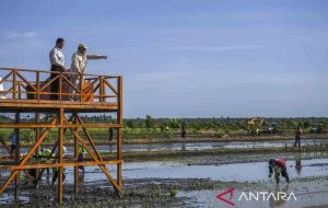 Presiden juga melihat langsung proses tanam padi dari atas menara pandang bersama Menteri Pertanian Andi Amran Sulaiman. Keduanya tampak serius mengamati langkah-langkah teknis yang dilakukan para petani di lapangan.