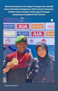 “Selamat kepada Lettu Agus Prayogo atas medali emas maraton SEA Games 2023 untuk Indonesia. Medali emas ketujuh untuk Agus Prayogo sepanjang mengikuti SEA Games,” unggah @Prabowo dalam story Instagramnya.