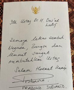 “Semoga lekas sembuh. Negara, bangsa, dan ummat sangat membutuhkan Ustaz. Salam hormat kami,” demikian bunyi surat Prabowo Subianto, Selasa (28/3/2023).