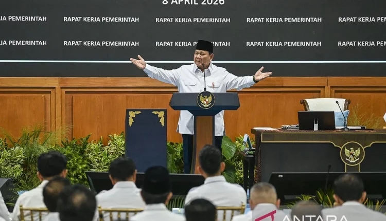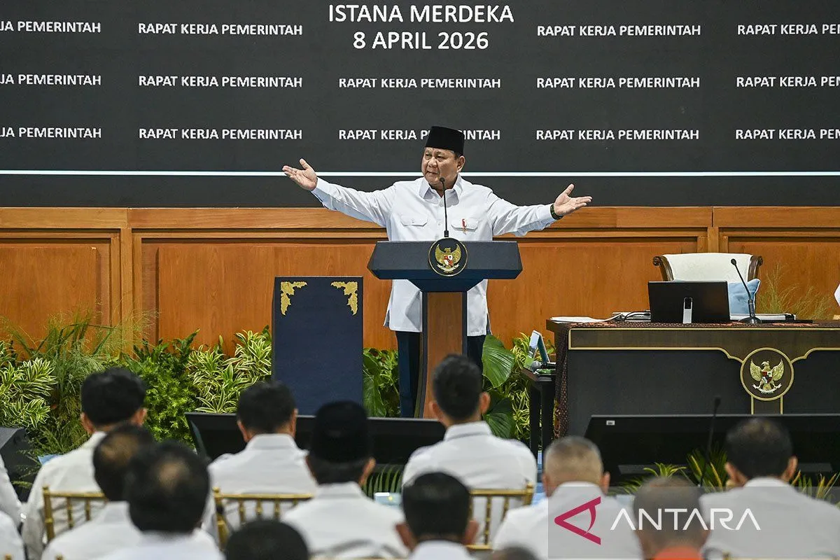 Presiden Prabowo Subianto memberi taklimat saat Rapat Kerja Pemerintah dengan Kabinet Merah Putih berserta seluruh Eselon I K/L dan Dirut BUMN di Kompleks Istana Kepresidenan, Jakarta, Rabu (8/4/2026). ANTARA FOTO/Galih Pradipta/kye/am.