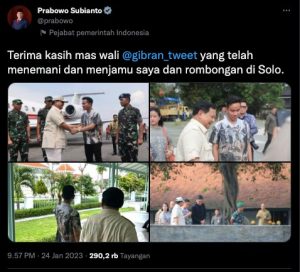 Cuitan Prabowo itu kemudian dibalas Gibran lewat akun Twitternya @gibran_tweet. Gibran menyampaikan terima kasih atas kunjungan Menteri Pertahanan Republik Indonesia (Menhan RI) Prabowo Subianto.