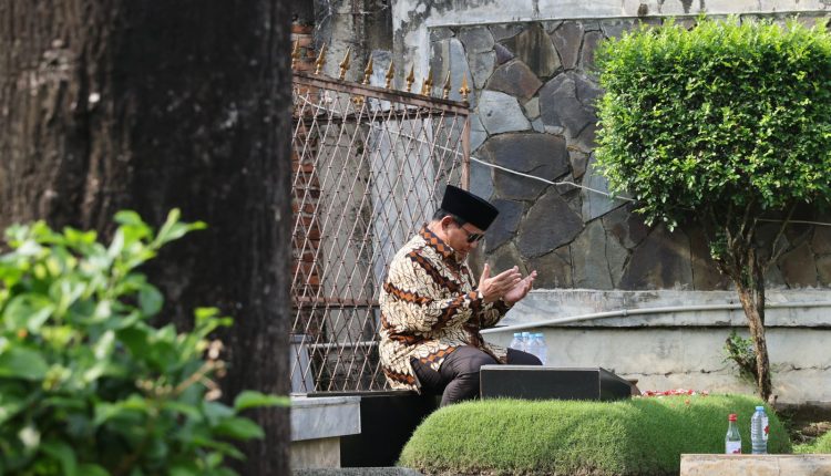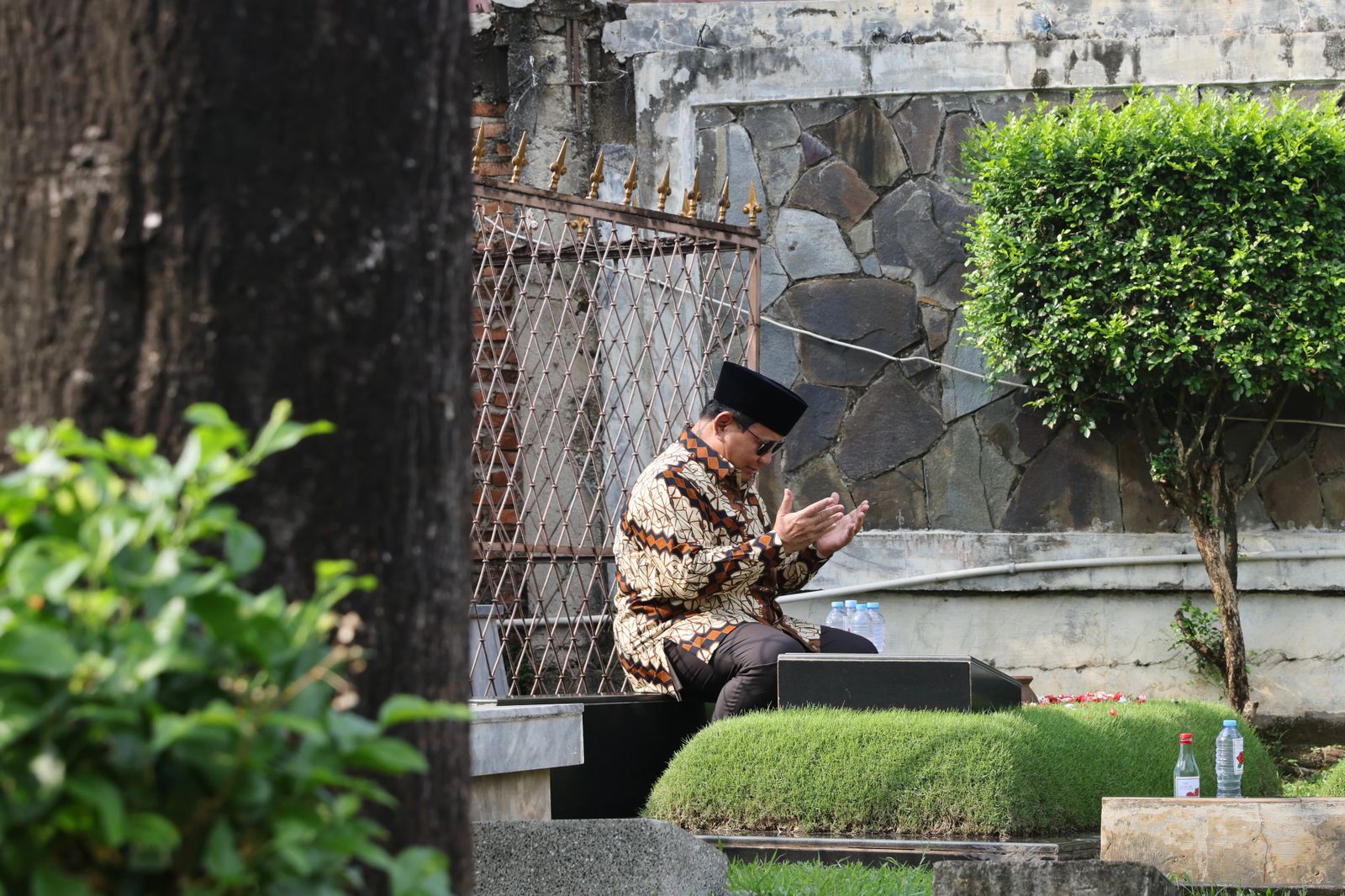 Prabowo berziarah ke makam ayahnya pada pagi hari. Ia datang seorang diri mengenakan pakaian batik dan kopiah hitam.