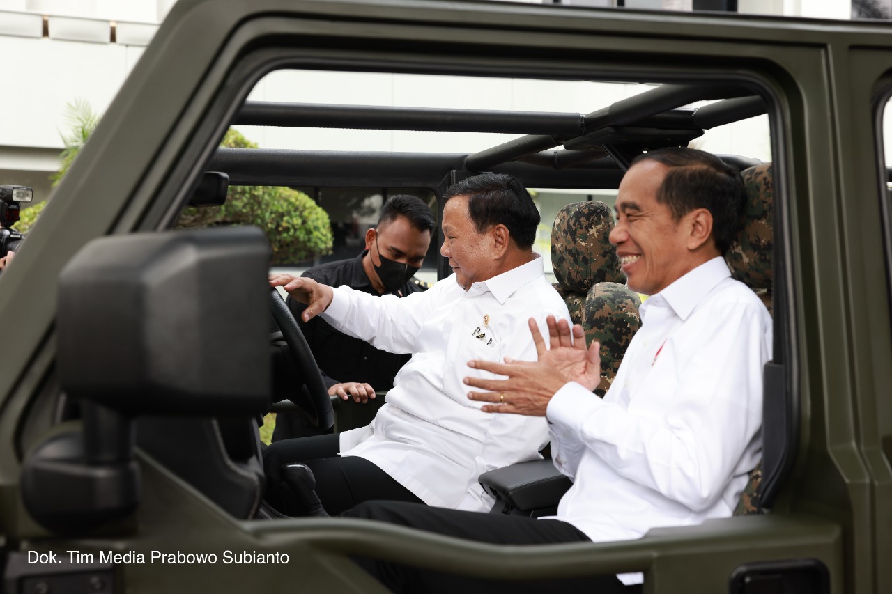 Menteri Pertahanan Prabowo Subianto terlihat menyetir mobil bersama Presiden Joko Widodo di sela Rapat Pimpinan Kementerian Pertahanan 2023, Rabu (18/1/2023).