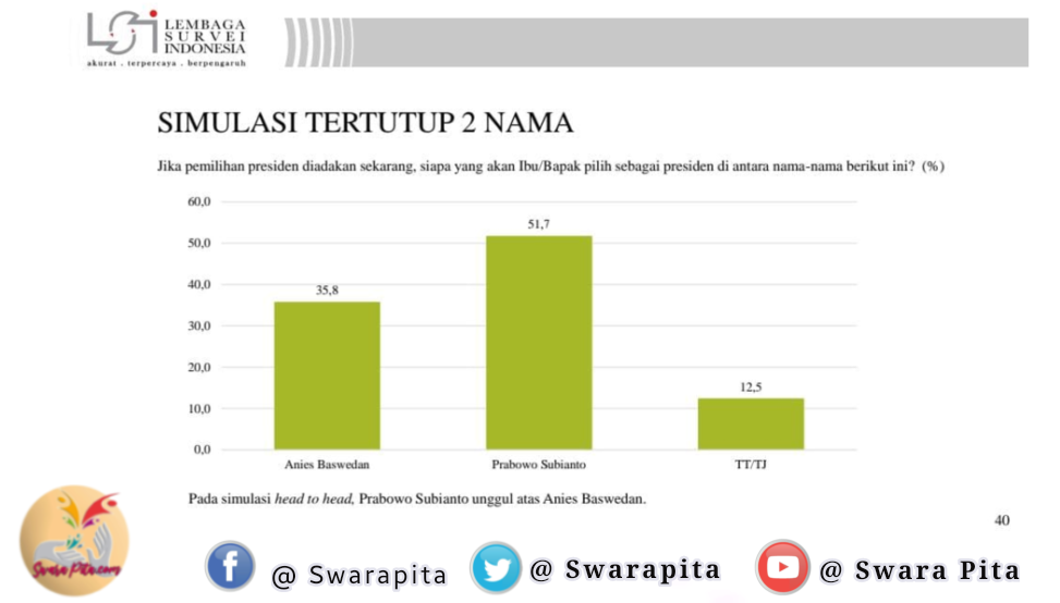 Swarapitacom, Jakarta – Lembaga Survei Indonesia (LSI) menemukan mayoritas masyarakat setuju presiden selanjutnya harus bisa melanjutkan pemerintahan Presiden Joko Widodo dan Menteri Pertahanan Prabowo Subianto adalah sosok yang dianggap paling mampu.