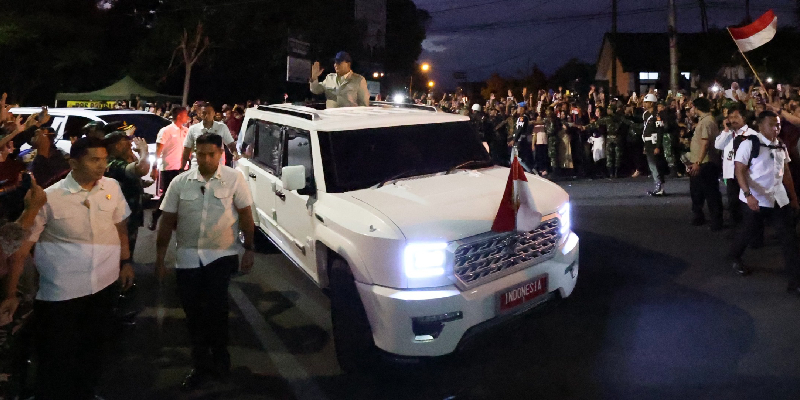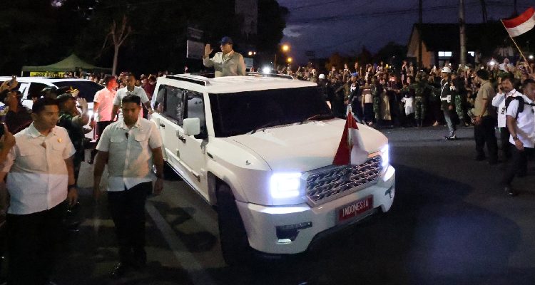 Prabowo yang menaiki mobil kepresidenan MV3 Garuda Limousine produksi industri pertahanan dalam negeri PT Pindad, pun pangsung menyapa warga yang menyambutnya dari atas mobil.